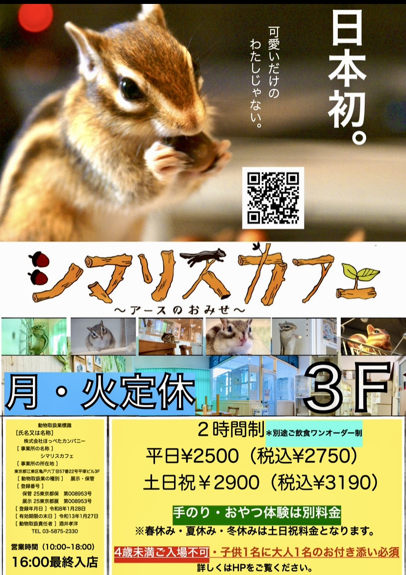 | 最終入店時刻 | 16:00最終入店 ただし、リスさんがウトウトしはじめましたら16:00より前にご案内を終了することも頻繁にございます。 ※シマリスは昼行性です。はじめてのお客様はリスさんが活発な時間帯、10:00〜14:00ごろのご入店がおすすめです。 |