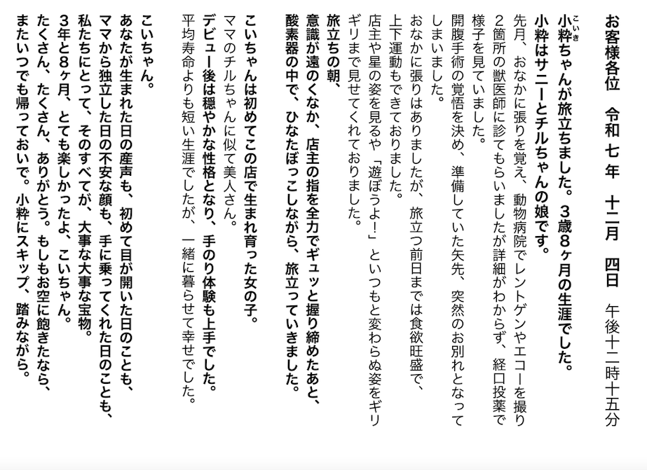 死後、剖検(病理検査)に出し、死因の究明を行います。結果がわかり次第、各SNSにて発信いたします。